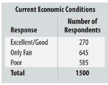 A Gallup Poll in March 2013 (www.gallup.com/poll/110821/gallup-daily-us-economic-conditions.aspx) asked 1500 U.S. adults to rate economic conditions in the country today as “excellent,” “good,” “only fair,” or “poor.” The results are below:If we select a person at random from this