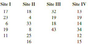 Another type of painted ceramic vessel is called three-circle red-on-white (see reference in Problem 1). At four different sites in the Wind Mountain archaeological region, the number of such sherds was counted in local dwelling excavations.Shall we reject or not reject the claim that there is no