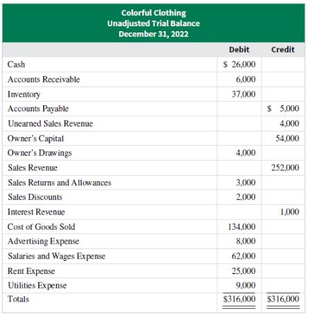 Colorful Clothing is a retailer in Atlanta, Georgia. The company sells gift cards and records the cash received in the Unearned Sales Revenue account. Presented below is the unadjusted trial balance for Colorful Clothing as of December 31, 2022.Adjustment data:1. Customers used gift cards to