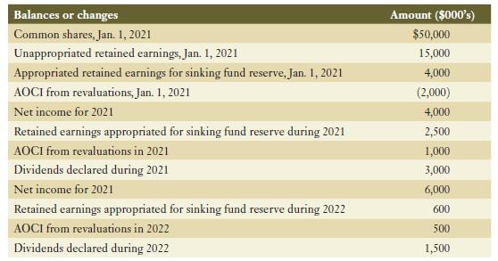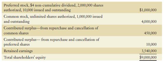 Hamilton Holdings had the following balances in shareholders’ equity as at December 31, 2021:In addition, the financial statement notes on this date indicated that two years of preferred share dividends were in arrears, totalling $1,400,000.The following transactions occurred during 2022:i.