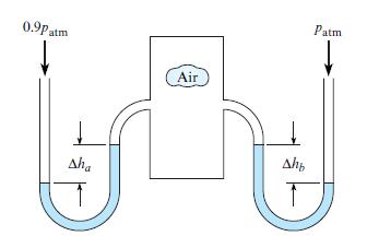 Two water manometers are connected to a tank of air. One leg of the manometer is open to 100 kPa pressure (absolute) while the other leg is subjected to 90 kPa. Find the difference in deflection between both manometers, Δha – Δhb. 0.9Patm Patm Air Aha Ahp