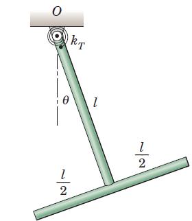 The body consists of two slender uniform rods which have a mass per unit length. The rods are welded together and pivot about a horizontal axis through O against the action of a torsional spring of stiffness kT. By the method of this article, determine the natural circular frequency wn for
