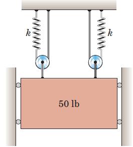 By the method of this article, determine the period of vertical oscillation. Each spring has a stiffness of 6 lb/in., and the mass of the pulleys may be neglected. 50 lb