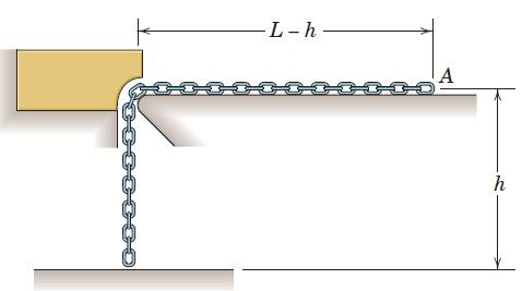 The chain of mass ρ per unit length passes over the small freely turning pulley and is released from rest with only a small imbalance h to initiate motion. Determine the acceleration a and velocity v of the chain and the force R supported by the hook at A, all in terms of h as it varies from
