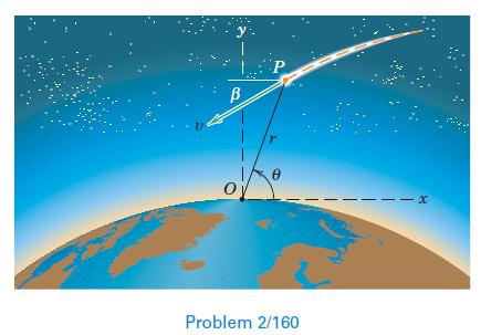 A meteor P is tracked by a radar observatory on the earth at O. When the meteor is directly overhead (θ = 90°), the following observations are recorded: r = 80 km, r˙ = −20 km/s, and θ˙ = 0.4 rad/s. (a) Determine the speed v of the meteor and the angle θ which its velocity vector makes with