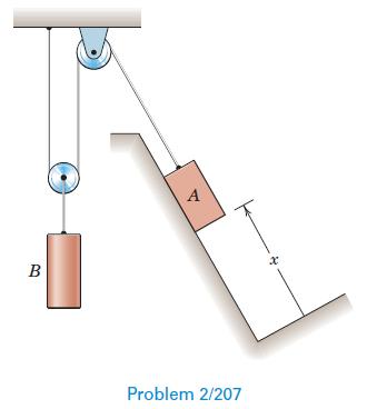 If the velocity x˙ of block A up the incline is increasing at the rate of 0.044 m/s each second, determine the acceleration of B. В Problem 2/207