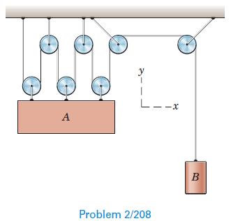 For a given value of y, determine the upward velocity of A in terms of the downward velocity of B. Neglect the diameters of the pulleys. 2b y A B Problem 2/219