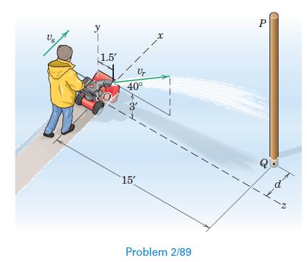 A snow blower travels forward at a constant speed vs = 1.4 ft/sec along the straight and level path shown. The snow is ejected with a speed vr = 30 ft/sec relative to the machine at the 40° angle indicated. Determine the distance d which locates the snow blower position from which an ejected snow