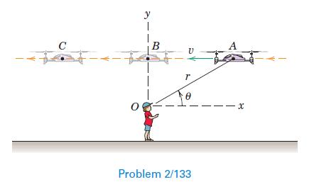 A drone flies over an observer O with constant speed in a straight line as shown. Determine the signs (plus, minus, or zero) for r, r˙, r¨, θ, θ˙ , and θ¨ for each of the positions A, B, and C. y В A Problem 2/133