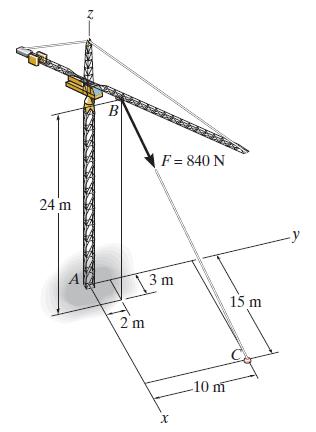 The cable of the tower crane is subjected to a force of 840 N. Determine the x, y, z components of reaction at the fixed base A. 24 m A B 2 m F = 840 N 3 m X -10 m 15 m
