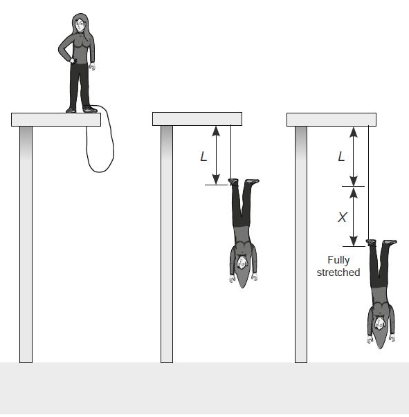 If the height of the cliff is 150.0 ft, K = 6.25 lbf/ft, L = 40.0 ft, and the person’s weight is 150.0 lbf, will the person be able to bungee jump safely? Support your answer by giving the final value for length = L + x. (A: 114 ft < 150 ft, OK)At full stretch, the elastic rope of original