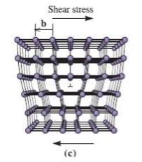 Suppose you would like to introduce an interstitial or large substitutional atom into the crystal near a dislocation. Would the atom fit more easily above or below the dislocation line shown in Figure 4-7(c)? Explain. Shear stress (c) Figure 4-7(c) (Repeated For Problem 4-39.)