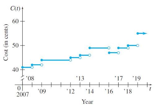In 2007, the United States Postal Service unveiled the first Forever Stamp. A Forever Stamp does not show a monetary value, and it may be used used to mail a one-ounce letter even if the postal rate changes in the future. The graph below shows the cost of a Forever Stamp, where C(t) is the cost in