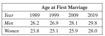 The following table lists the U.S. median age at first marriage for men and women. The age at which both groups marry for the first time seems to be increasing at a roughly linear rate in recent decades. Let t correspond to the number of years since 1980. (a) Find a linear equation that