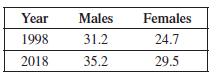 More people are staying single longer in the United States. The following table gives the percent of never-married adults, age 15 and over, by gender, for the years 1998 and 2018. The growth has been approximately linear.(a) Find a linear function, m1t2, for the percent of never-married males in