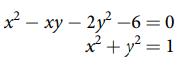For the following exercises, find the solutions to the nonlinear equations with two variables. x² - xy - 2y²-6=0 x² + y² = 1
