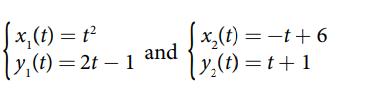 For the following exercises, use the table feature in the graphing calculator to determine whether the graphs intersect. [x₂ (t) = t² y₁ (t) = 2t - 1 and x₂(t) = -t+6 |y₂(t)=t+1