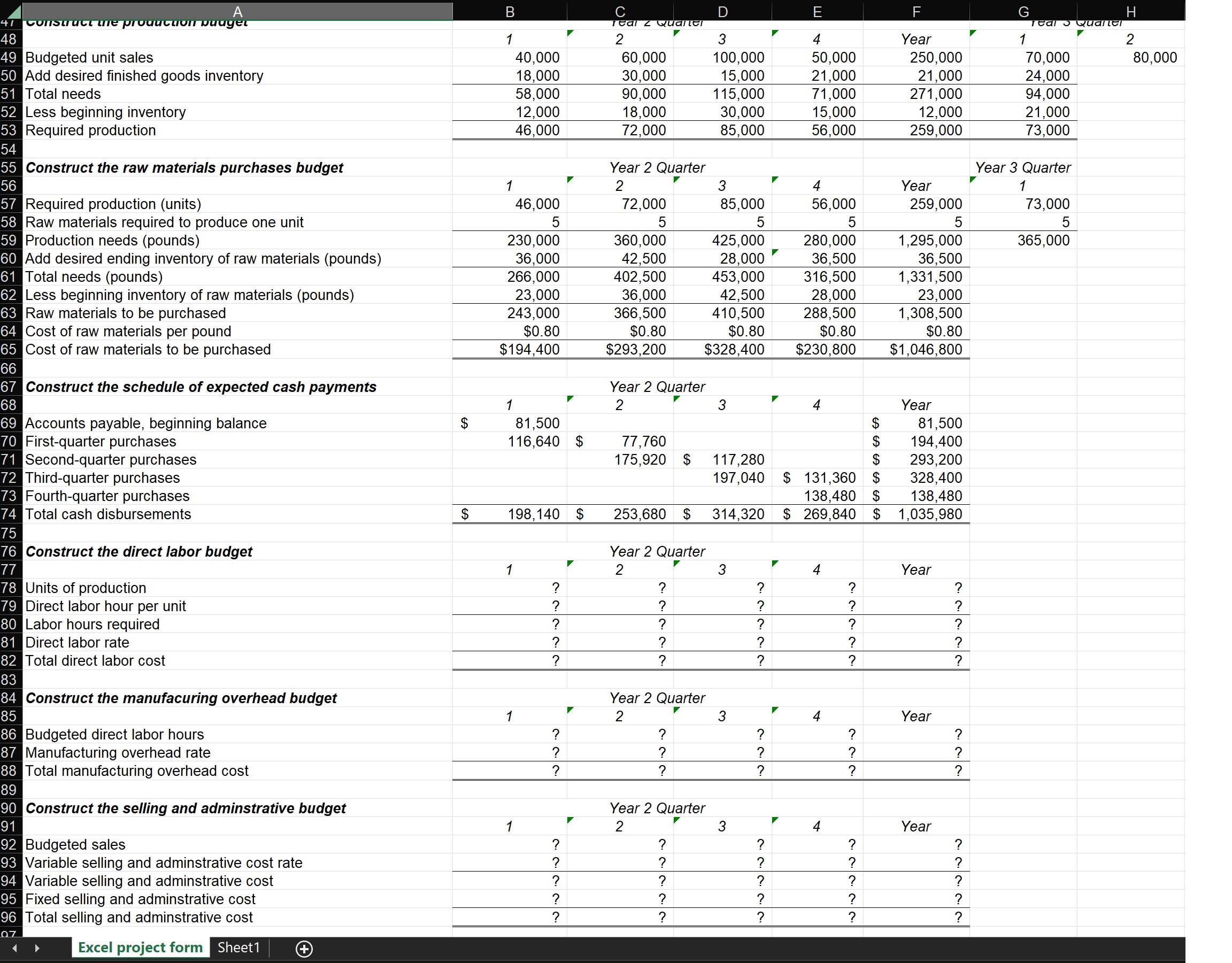 I need the excel formulas for the cells with question marks, please!