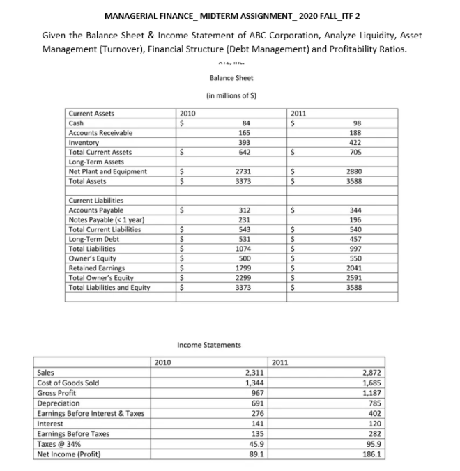 Question: MANAGERIAL FINANCE_MIDTERM ASSIGNMENT 2020 FALL_ITF 2 Given the Balance Sheet & Income Statement of ABC Corporation, Analyze Liquidity, Asset Management (Turnover), Financial Structure (Debt Management)