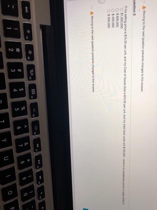 Moving to the next question prevents changes to this answer. uestion 2 If my selling price is $15.00 per unit, and my Cost of Goods Sold is $10.00 per unit, and my total fixed costs are $150,000-what is my breakeven points in sales dollars? $1,000,000 $600,000 $450,000 $ 300,000 Moving to the next question prevents changes to this answer. esc 7 20 F3 $ COO 200 $4 54 % 25 #3 @ 2 C < 6 11 9 99 & 7 8* 8 63 9 TY U 0 P