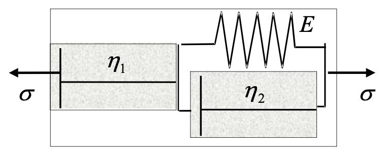 Tissues are generally viscoelastic, therefore mechanical properties changes when loaded at longer timescales. There are several models for viscoelasticity, and they range in complexity. Derive the generalconstitutive equations for the two models below. Put all stress terms on the left-hand side of the equationand all strain terms on the right-hand side of the equation.