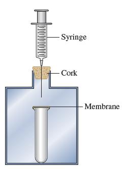 Consider the following apparatus: a test tube covered with a nonpermeable elastic membrane inside a container that is closed with a cork. A syringe goes through the cork.a. As you push down on the syringe, how does the membrane covering the test tube change?b. You stop pushing the syringe but