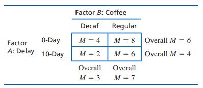 Suppose that a researcher was interested in the effect of caffeine on memory. She measured memory performance either immediately after studying (0-day delay) or after a 10-day delay. Half of the participants in each delay group received either a cup of decaffeinated coffee or a cup of regular,